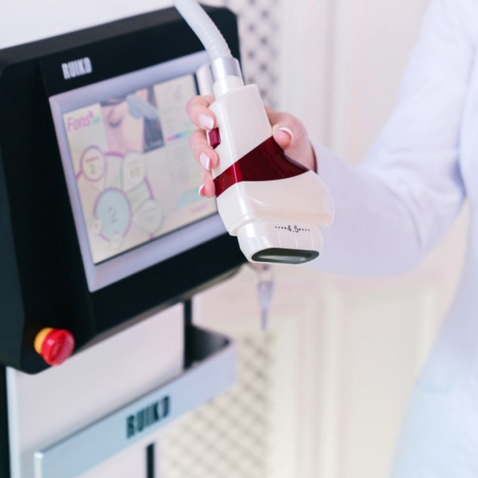 Метод HIFU (высокоинтенсивного сфокусированного ультразвука) позволяет воздействовать одновременно на все слои кожи, даже на самые глубокие. В основе работы аппарата лежат УЗ-импульсы разной длины. Короткий и длинный лучи параллельно находят точку и фиксируются на ней. В этот момент на участке ткани образуется микроскопический защип. Когда таких защипов на SMAS-слое много, получается, что ткань скручивается и подтягивает за собой остальные слои кожи, которые лежат выше.